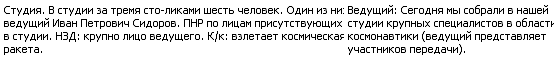 Попросите на студии сценарий телевизионной передачи... Скорее всего, вам предложат рукопись такого вида: лист разделен пополам, с левой стороны написано про то, что должно быть изображено на экране, а с правой — слова, которые произносятся за кадром или в кадре участниками передачи. Ну, примерно так: