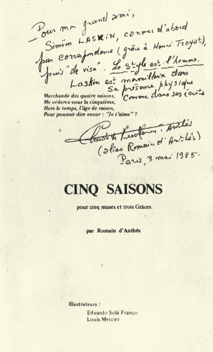 Роман д'Антес (литературный псевдоним Клода). Титульный лист сборника «Пять сезонов».