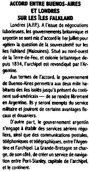 Лондон (АФП). «В итоге трудных переговоров британское и аргентинское правительства 1 июля пришли к согласию „заморозить“ вопрос о принадлежности Фолклендских (Мальвинских) островов. На расположенный к северо-западу от Огненной Земли бывший с 1834 года британской колонией архипелаг теперь предъявляет претензии Аргентина.