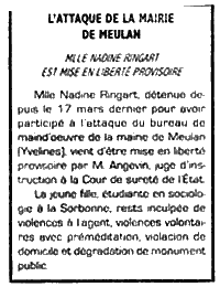 – Слушай. Нападение на мэрию в Мёлане. Мадемуазель Надина Ренгар условно выпущена на свободу. Это заголовки. Мадемуазель Надина Ренгар, арестованная семнадцатого марта за участие в нападении на бюро по найму рабочей силы в мэрии Мёлана (Ивелин), на днях выпущена условно на свободу мсье Анжевеном, следователем Отдела государственной безопасности. Эта девушка, студентка социологии в Сорбонне, обвиняется в насильственных действиях против полиции, причем преднамеренных, в нарушении неприкосновенности жилища и в порче общественного здания.