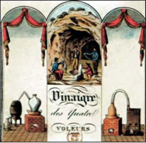 Во Франции до сих пор утверждают, что разбойники, которых в XVI веке заставили хоронить жертв эпидемии чумы, обязаны своим спасением уксусу, настоянному на чесноке. Но, видимо, неблагородный запах такого зелья, подходивший для грубых носов разбойников в XVI веке, в XVIII столетии уже был непереносим для обоняния представителей более высоких слоев общества, и поэтому под пользовавшимся популярностью интригующим названием в аптеках стали продавать уксус, настоянный на чесноке и ароматических травах.