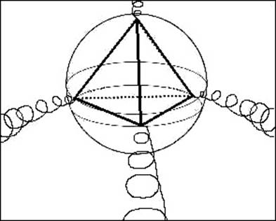 При дальнейшем исследовании, другие планетарные циклы могут создавать другие геометрии, включая пятиугольники или шестиугольники. И если мы вернемся к изучению кругов на полях, то вспомним: работа Джеральда Хоукинса продемонстрировала, что такие двумерные схемы могут быть расширены в три измерения. А мы уже видели, что появляющийся на Солнце трехмерный октаэдр ответственен за бомбардировки положительной и отрицательной энергии, которые на Земле мы получаем дважды в месяц. И когда мы смотрим на поведение такой системы, как Огромное Красное Пятно на Юпитере, находящееся на широте 19,5 градусов, можно предположить, что похожее гармоническое излияние энергии Света происходит с уровня тетраэдра, медленно двигаясь в Солнечной Системе как гигантская газонная дождевальная установка, создаваемая вращением Юпитера: