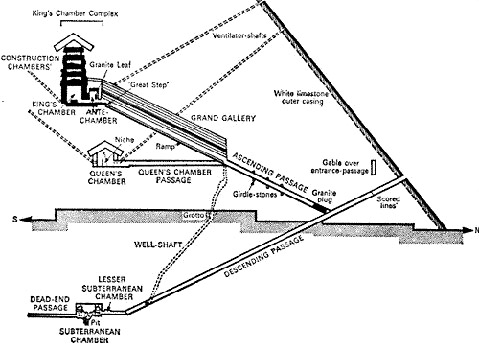 “Тогда… началось строительство того, что сейчас называется Гизой… Зала Посвященных… Он содержит все записи, с самого начала переданные жрецом… на тот период, когда происходит изменение положения земли и возвращение Великого Посвященного в эту и другие земли, чтобы раскрыть запечатленные в нем пророчества. Там показаны все изменения, которые произойдут в религиозной мысли мира, посредством разнообразия способов, которым проходится галерея, от основания до вершины — или до открытой гробницы и верха. Это символизируется как слоем и цветом, так и направлением поворота.