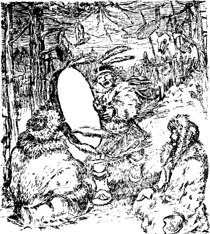 Шаман поставил бога около священного дерева и поднял кверху голову. Остекляневшими глазами он посмотрел вокруг и со страшной силой ударил медвежьей лапой в бубен. Удары сыпались один за другим. Шаман прыгал, как сумасшедший, вокруг дерева, кричал сдавленным тонким голосом, бил и щипал себя, извивался от боли. Еремча и Пальси раскачивались в такт шаману. Пальси шептал: