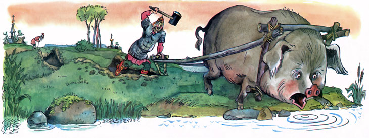 Наш пескарь всё это слышит:От волненья еле дышит:Выпустил три пузыря —Был — и нету пескаря.У моста он срезал палку,Привязал к концу мочалку,На коня — и ну скорейДогонять богатырей.Те хохочут во всю глотку:— Знатную забыл ты плётку!Насмешил так насмешил:За мочалкою спешил!Долго, коротко ли едут…Время близится к обеду,Разыгрался аппетит…Видят — яблоня стоит.А Иван соображает,Братьев он опережает,Рубит яблоню мечом —Кровь ли сок течёт ручьём!Братья злятся на него:— Видно, братец наш — того!..Наступает полдень жаркий.Вдруг возник колодец с чаркой.Просто страсть охота пить…А Иван соображает,Что опасность угрожает —И мечом его рубить!Братьев тут взяла досада.Костерят дорогой брата:— Ты в уме, Иван, иль нет? —Сын коровий им в ответ:— Даже если ты герой,То не пей воды сырой! —Скачут дальше. Дело к ночи.Спать охота — нету мочи,Просто страсть охота спать…Вдруг раскрылись сами очи:На лугу стоит кровать:Расписные покрывала,Пуховые одеяла…— Поваляемся на них —Места хватит на троих!Размечтались наши братья.А Иван с мечом к кровати:Только стон стоит… да пухСловно стая белых мух.Братья злятся: — Ты свихнулся! —Сын коровий усмехнулся:— Мягко стелют — жёстко спать!Дома будем отдыхать!А дорога вилась, вилась,И внезапно раздвоилась…Братья тут и говорят:— Без тебя поедем, брат!Ты, конечно, бился смело,Но теперь другое дело.И покуда всюду мир,Нам не нужен командир!Ускакали… Вот одинВ ночь спешит коровий сын.Вскоре где-то за спиноюСлышит хрюканье свиное…Богатырь вперёд летит,Видит — кузница стоит:В ней двенадцать кузнецов,Разудалых молодцов!— Эй, — кричит он, — не зевайте!Дверь железом обивайте…Да покрепче, кузнецы,Раскалите мне щипцы!Прибежит сюда свинья,Будет требовать меня.Вы скажите: «Мы поможем,Прямо на язык положим.Ты под дверь просунь язык —И его проглотишь вмиг…»Вмиг работа закипела.Кузнецы взялись за дело:Дверь обили молодцы,Раскалили и щипцы.Гром гремит. Земля трясётся.По земле свинья несётся…Прямо к кузнице бежит,Вся от ярости дрожит:— Ну-ка двери открывайтеИ Ивана мне отдайте —Всех вас, если захочу,Вместе с кузней проглочу!Кузнецы и говорят:— Нам Иван ни брат, ни сват…Коли хочешь — мы поможем,Прямо на язык положим,Ты его проглотишь вмиг…Только сунь под дверь язык! —Ведьма, кузнецам поверив,Свой язык суёт под двери…А Иван — щипцами хвать:— Эй, ребята, не зевать!