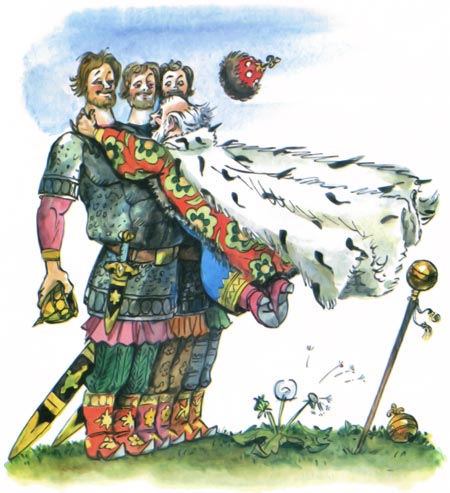 Царь с царицей их встречают.Всей столицей их качают:Головой — чуть не в Луну…Так качали в старину!У царя для всех награды.Для царевича — наряды:Привезён из дальних странМодный джинсовый кафтан —Нет такого на Руси,Надевай, сынок, форси!И второй доволен брат:Лучше в мире нет наград,Чем скатёрка-самобранка,Да ещё варенья банка!А Иван — коровий сынПросит сена стог один.Пир — горой. А он к корове,Бросил сена в изголовье…Ты Ивана не буди,Свадьба будет впереди!
