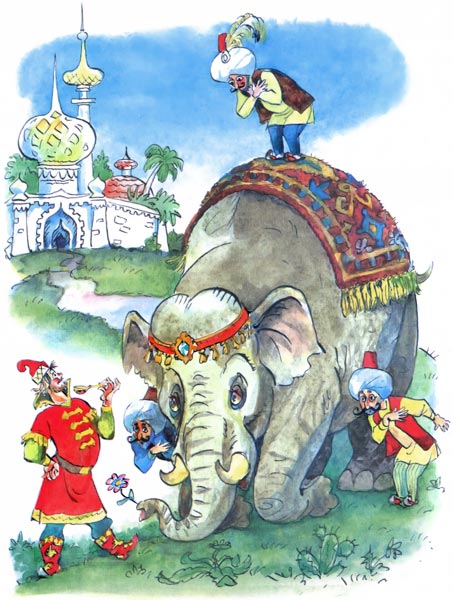 Встал король индийский рано,Съел на завтрак три банана,Посмотрел в окно на луг —И шатёр увидел вдруг.— Кто посмел, — кричит он слугам. —Заповедным ехать лугом?На колу висит чей флаг?Всё узнайте… так-растак! —Вот бегут к шатру гонцы:— Вы откуда, молодцы,И какого роду-званья —Королевичи? Купцы?Молвят сваты слогом старым:— Не купцы, да за товаром,Не за разной колбасой —За Марьяною-красой…В общем, хочет наш купец —Взять Марьяну под венец!Так сказали молодцы!И назад бегут гонцы.Был доклад без проволочки.А король с вопросом к дочке:— Что ответить? — Шли отказВместе с войском… — И тотчасВойска собралось без счёта —Пушки, конница, пехота,И в попонах боевыхСто слонов идут на них…— Не дают нам, видно, Машу, —Помешал брат старший кашу.Размахнулся черпаком —Шмяк! — полвойска кувырком.Два махнул — не промахнулся!..Повар к братьям повернулся:— Больше к нам не будут лезть…Эй, садитесь кашу есть! —
