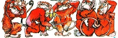 — Раз, два! — кричала мартышка, кувыркаясь. — Левой, правой! Дважды… — И тут мартышка, которая начала кувыркаться с головы, докувыркалась до хвоста.