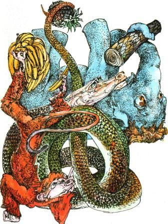 Когда удав почувствовал, что попугай ухватился за хвост, он выдернул его вместе с попугаем.
