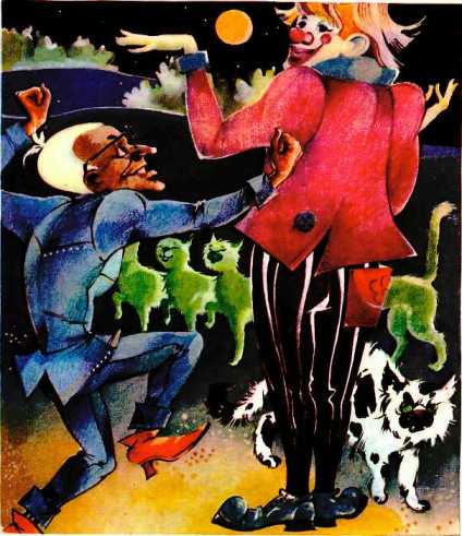 И Котькин — наш благородный приятель Котькин! — широкими прыжками кинулся наперерез трактору и как бы заслонил собой клоуна. Нежно-зелёный хвост отважно колыхался в лунном свете.