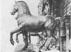 В 1204 году дож Энрико Дандоло во главе крестоносцев взял Константинополь. В качестве трофея он вывез оттуда коней, снятых с арки византийского императора. Кони сначала стояли на постаменте около Дворца дожей, но в 1797 году по приказу Наполеона, войска которого заняли Венецию, коней отправили в Париж и установили на площади Карусели напротив Лувра, где знаменитая квадрига пробыла восемнадцать лет.