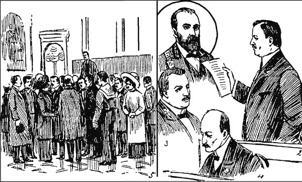 Суд над Н. А. Маклаковым. Иллюстрация из газеты «Петербургский листок» от 11 апреля 1912 года.
