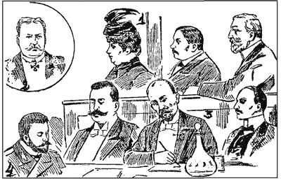 Дело Ольги Штейн в окружном суде: 1. Ольга Штейн, фон Дейч и Малыгин (подсудимые); 2. Председатель окружного суда фон Паркау; 3. Защитники: гг. Пергамент, Базунов, Трахтерев; 4. Прокурор Громов («Петербургский листок», 1907, № 331,2 декабря).