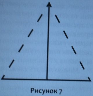 Известно, что в дополнительности, в которой два термина рассматриваются как активный и пассивный по отношению друг к другу, активный термин обычно символизирован вертикальной линией, а пассивный термин — горизонтальной [42] . Небо и Земля также иногда представляются согласно этому символизму. Только в этом случае обе линии не пересекаются, как они это делают, образуя крест, так как очевидно, что символ Неба должен располагаться над Землей целиком: следовательно, это перпендикуляру имеющий свое основание на горизонтали [43] . Эти две линии могут рассматриваться как высота и основание треугольника, боковые стороны которого, исходящие от «вершины Неба», в действительности определяют размер поверхности Земли, то есть ограничивают «площадку», служащую опорой проявления (рис. 7) [44] .