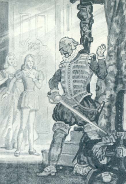 Белее лилий, тоньше горностая.Из бездны смерти, в которую низвергли его слова отца, проклятый сын вознесся к жизни на крыльях этой песенки. Хотя у него едва не разорвалось сердце при столь внезапном переходе от ужаса к счастью, он собрал свои силы и, впервые в жизни взглянув отцу прямо в глаза, ответил на презрение презрением и с ненавистью сказал: