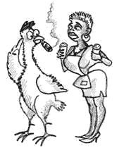Скандалеза вызвала цыплёнка, курящего табак, из специального приусадебного хозяйства табачной фирмы «Филипп Моррис». Цыплёнок незамедлительно явился. Резать цыплёнка и ощипывать Скандалеза не решилась, потому что это не было указано в рецепте, а взять на себя такую ответственность она не могла. Подписав цыплёнка под добровольным согласием послужить в качестве цыплёнка табака Соединённым Штанам, она привела его к присяге и стала натирать солью и перцем поверх перьев. Цыплёнок не сопротивлялся, потому что был связан присягой, но отчаянно чихал и шёпотом критиковал правительство. Скандалеза отворачивалась, чтобы не слышать критики, которая в такое тяжёлое время для страны не могла быть полезной, и думала сама себе, что это ничего, что цыплёнок не зарезан и не ощипан. Сейчас так принято – подают в ресторанах нечищенную картошку, морковку с комьями земли – это так модно. Почему бы не подавать цыплёнка в перьях?