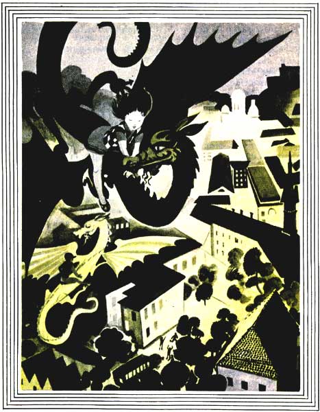 Вещей драконы взяли с собой совсем немного и собрались в считанные минуты. Когда они с детьми были уже на крыше, у дома с визгом затормозили три полицейские автомашины с антеннами, синими огнями и сигнальными сиренами. Из машин выскочили несколько полицейских (в стальных шлемах). Среди них был и тот, что принимал заявление о розыске. На нём была теперь форменная фуражка. Он вошёл в сад, остановился на дорожке, посыпанной гравием, и поднёс ко рту мегафон.