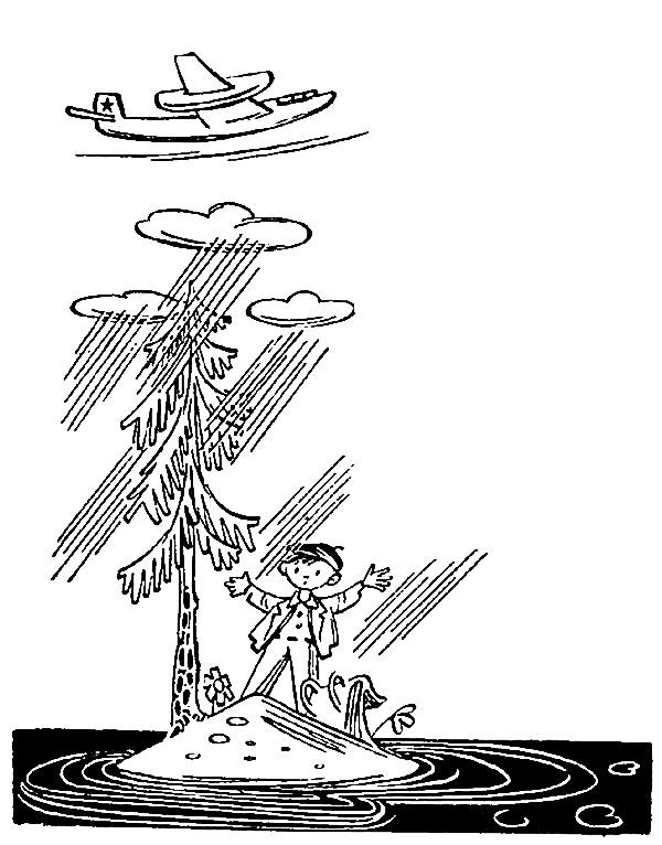 Ребята прислушались. Гудя моторами, над островом пролетал самолет. Вова выскочил из шалаша и посмотрел в небо. Но совсем низко над лесом, задевая верхушки деревьев, мчались серые, угрюмые тучи, закрывая синее небо, солнце и самолёт, который спокойно летел себе высоко над землей.