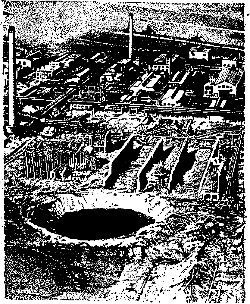Чувствительность некоторых взрывчатых веществ к внешним воздействиям настолько мала, что это иногда и в наше время приводило к недооценке возможности взрыва, имевшей катастрофические последствия. На немецком химическом заводе в Оппау в числе других продуктов производилась удобрительная смесь, состоящая из аммиачной селитры и сернокислого аммония. Завод работал круглый год, ко смесь вывозилась в сельские районы только осенью. Готовый продукт ссыпали в заводские склады. При длительном хранении рыхлый порошок слёживался в сплошную камнеобразную массу. Дробление этой массы обычными механическими способами при разгрузке складов было затруднительным, и па заводе применили для этой цели взрывной способ. Предварительно обычными испытаниями установили, что смесь не взрывается. Было произведено около двух тысяч подрывов слежавшейся смеси, и вдруг при очередном подрыве, утром 21 сентября 1921 года, склад, а вместе с ним и весь завод взлетели на воздух. На месте взорвавшегося склада образовалось озеро длиной 165, шириной около 100 и глубиной около 20 метров (рис. 2).