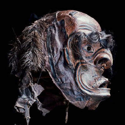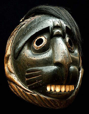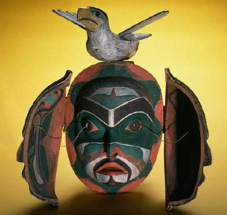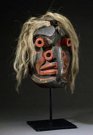 "Как бы то ни было, в конце XIX в. еще выстраивалась цепочка деревень на берегу и на островах от залива Аляски до юга Ванкувера. В период их наибольшего процветания племена северо-западного побережья могли сосредоточивать в себе сто — сто пятьдесят тысяч душ — ничтожная цифра, когда мы думаем об интенсивном проявлении и о решающих уроках искусства, выработанного по всей этой отдаленной провинции Нового Света популяцией, плотность которой варьировала в разных регионах от 0,1 до 0,6 жителя на квадратный километр. На севере мы обязаны тлинкитам скульптурами, выполненными с тонким поэтическим воображением, изысканно украшенными; затем, к югу, хайда — монументальными творениями, полными строгости; цимшиан, у которых они, возможно, сопоставимы с более человеческой чувственностью; белла-кула, маски которых выражают помпезный стиль и где доминирует голубой кобальт; квакиутль, с разнузданным воображением, в изготовлении своих танцевальных масок предающимся изумительной открытости формы и цвета; нутка, сдерживаемым более мудрым реализмом; наконец, на крайнем юге, — сэлиш, чей весьма упрощенный стиль делается угловатым и схематичным, и у кого сглаживаются северные влияния".