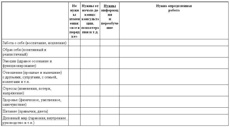Посмотрите на различные области жизни в левой колонке, отметьте одну из четырех соответствующих колонок справа (выбирайте ТОЛЬКО ОДНУ в каждой области).