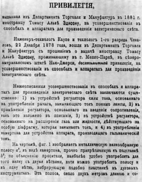 Привилегия (патент) Эдисона на усовершенствования в лампах накаливания.