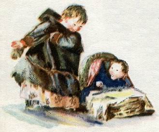 Теперь надо поиграть с Николяем: маме надо шить тобоки. Она сидит в малице — тёплой шубке из оленьего меха; в таких на севере зимой и ходят и работают. Малица шьётся мехом внутрь, и мех в ней полегче, а совик — мехом наружу. Мех на совик берётся пышный, красивый. В дорогу, когда стоят большие морозы, надо надевать сначала малицу, а поверх неё совик. Тогда уж никакой мороз не страшен.