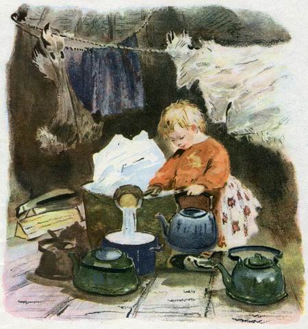 Тут-то и начинается работа! Окся снимает свой совик, берёт чайник и ковшик. Очень весело льётся в чайник вода! Один чайник уже полон. Окся смеётся — вот как интересно работать! — и берёт другой.