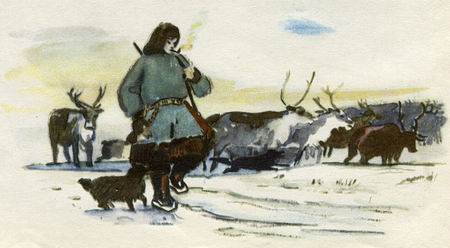 Так и ходят стада оленей по тундре в поисках корма. А пастухи идут за стадом, оберегают оленей: в тундре много волков. Зимой волки всегда голодны, они нападают на стадо, отбивают в сторону оленей. Тут пастухам надо смотреть во все глаза. Трудное это дело — уберечь от волков тысячи оленей.