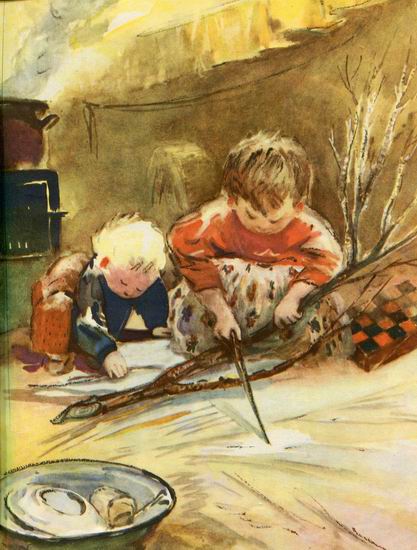Окся берёт большой нож, им она рубит хворост, сложенный на полу у печки. Наклонив голову, смотрит, как весело разгорается огонь. Братишка проснулся, повернул головку. Ему этот красивый огонь тоже нравится, и он тянется ручонкой к печке.