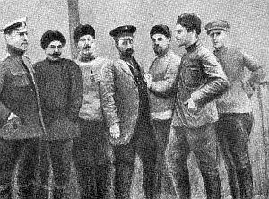 На мостике „Святого Фоки“ в Баренцевом море Слева направо: Седов, штурман Сахаров. Павлов, капитан Захаров, Кушаков, Пинегин, Визе.