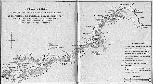 ОТЧЕТНАЯ КАРТА МАРШРУТНОЙ С'ЕМКИ ПРОИЗВЕДЕННОЙ СТАРШ. ЛЕЙТЕН. СЕДОВЫМ В 1913 ГОДУ СТАРЫЙ БЕРЕГ НАНЕСЕН ПУНКТИРОМ