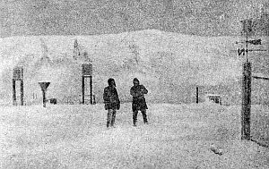 Надеясь на свет луны, вечером тронулись в путь. Но очень скоро разразилась буря невиданной силы. Не решаясь в темноте выбрать новое место для палатки, вернулись назад, к старому лагерю. Палатку рвало ветром, невыносимый холод заставлял Седова и матросов прижиматься друг к другу. Нескольких собак пустили в палатку – они мерзли, их визг вызывал жалость. В такую погоду лучше всего спать. Но судьба судила иначе.