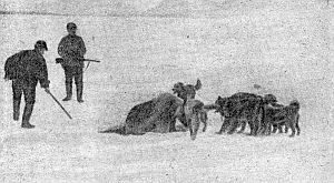 Казалось, что все медведи Новой Земли собрались сюда на какой-то свой праздник. Только Седов заснул, собаки начали лаять. Выскочив с ружьем, Седов не мог решить, в какую сторону итти, – он был окружен непроницаемым мраком. Даже по слуху нельзя было определить, откуда доносится визг собак, – все перемешалось в завываниях метели. Выручил Варнак. Поняв, что темнота мешает людям разглядеть медведя, он стал им указывать дорогу, двигаясь впереди и подавая сигналы призывным лаем. Медведь оказался возле снежной избушки, к которой, должно быть, его привлек запах спрятанного мяса. Седов увидел рядом с избушкой другой, более крупный холм. И когда эта гора зашевелилась, Седов выстрелил. Медведь, рыча, свалился. Повторилась обычная история. Собаки ринулись на раненого, он вскочил, побежал. Началось преследование во мраке. Седов шел на лай собак. Так он оказался вплотную перед самым зверем. Медведь двинулся на Седова. Спасли собаки – они вцепились ему в бока, а Варнак, по обыкновению своему, вскочил медведю на спину. Седов еще раз выстрелил, но опять только ранил зверя – тот умчался, собаки его задержать не смогли.