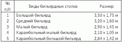 Бильярдные столы бывают двух видов – лузные и карамбольные. Столы бывают различных размеров. Наиболее распространенные из них приведены в табл. 1.