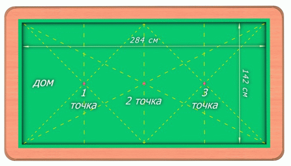 Разметка карамбольного стола отличается от разметки лузного и американского бильярдов.