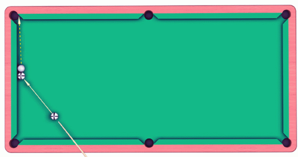 При необходимости выполнить чрезмерную резку в лузу по правому борту от игрока биток следует ударять крутым правым эффе. Результат удара в этом случае будет аналогичен предыдущему.