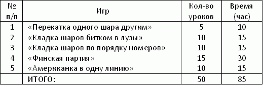 Все описанные выше игры каждый игрок, желающий стать профессионалом, должен освоить обязательно. Без этих игр дорога в большой и увлекательный мир бильярда может считаться закрытой. Количество проводимых тренировочных игр представлено в табл. 3.