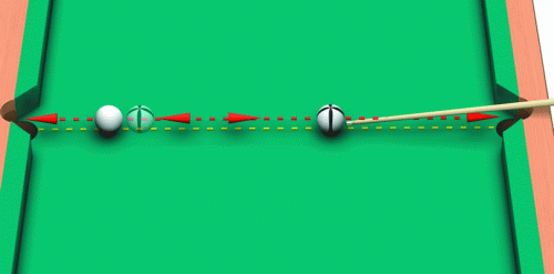 Для того чтобы положить оба играемых шара в лузу, нужно с «оттяжкой» битка нанести удар по прицельным шарам. При этом первый (дальний) шар упадет в лузу вследствие удара от играемого шара, а второй шар окажется в лузе после столкновения с вращающимся битком.
