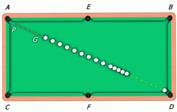14 играемых шаров выстраивают по прямой так, как показано на рисунке. При этом 10 шаров должны находиться один от другого на расстоянии, равном диаметру шара. Близко к 10-му ставят еще четыре шара. 15-й шар находится в растворе угловой лузы. Следует положить 15-й шар «своим», стоящим на любой точке отрезка PG.