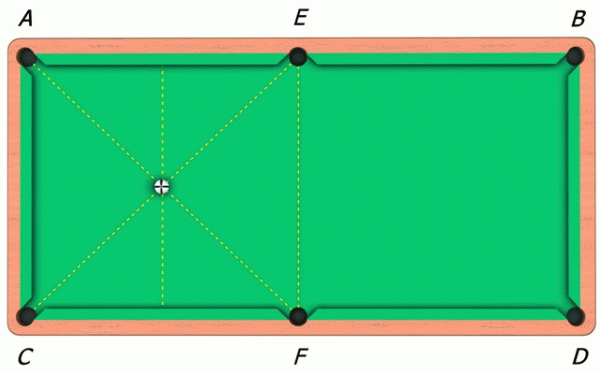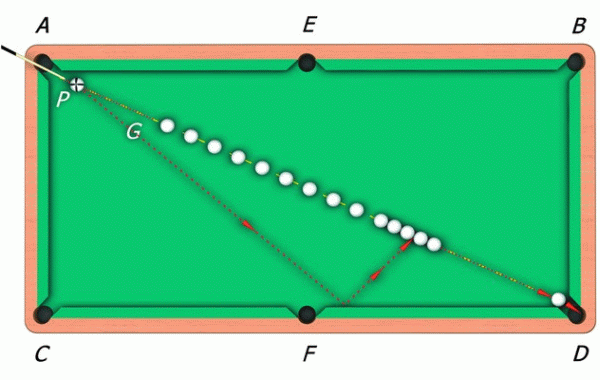 Из данной точки под углом, равным углу FGD, вновь проводят линию и ведут ее до пересечения с проходящей по диагонали прямой AD. Точка пересечения данных линий и будет являться точкой прицела и местом расположения битка. После выполнения дуплета первый из четырех шаров направится в сторону 15-го шара и столкнет его в лузу.