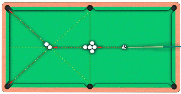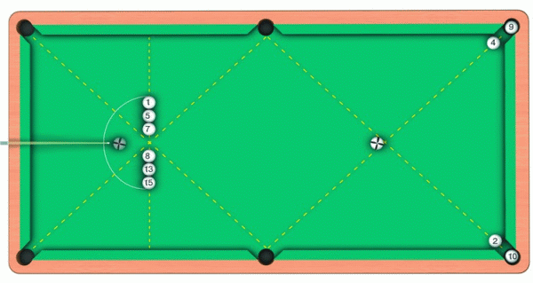 Прежде всего, нужно осторожно, не нарушая линии и не сдвигая шары с места, кием оттолкнуть биток немного назад, к короткому борту, но так, чтобы он остановился в районе очерченного мелом полукруга. После этого по «своему» шару нужно нанести достаточно сильный удар, в результате которого биток столкнется с «двойкой» и «четверкой». Эти шары, в свою очередь, направятся к шарам, находящимся в растворах угловых луз, и положат их.