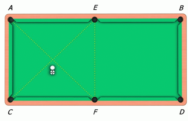 Необходимо поочередно загнать «свой» шар в лузы A, E и B. При выполнении каждого из ударов следует устанавливать точку прицела на линии AB.