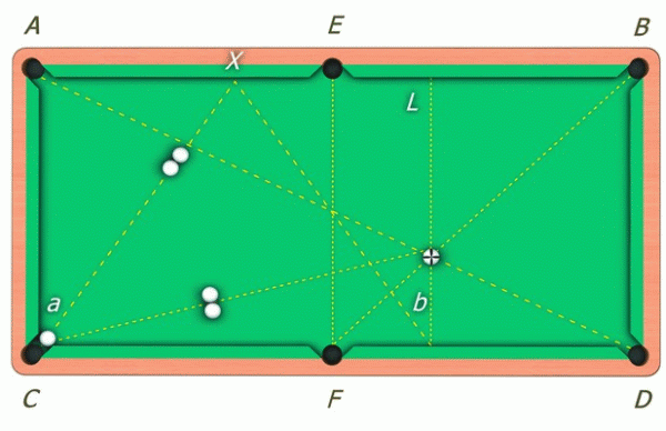 По условию задачи угол a равен углу b. Следовательно, и треугольники, содержащие такие углы, равны. Таким образом, только в точке X угол падения будет равен углу отражения, а значит, именно эта точка и станет точкой прицеливания. В результате удара «свой» шар сначала будет двигаться по биссектрисе bX, а затем, отразившись от длинного борта, по биссектрисе Xa. После этого биток столкнется с прицельным шаром и положит его в лузу.