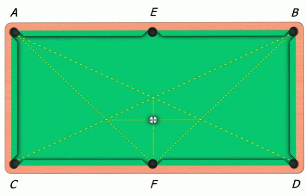 Необходимо установить такую точку прицеливания, чтобы пущенный ударом шар трижды ударился о борта EB, BD и DF, после чего упал в лузу E. При расчете следует учитывать то условие, что угол падения равен углу отражения.