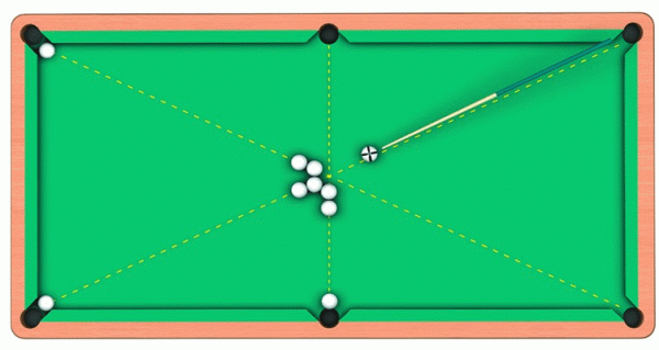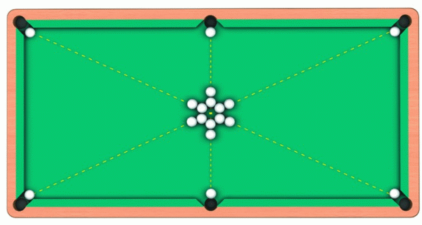 Пять играемых шаров нужно выставить в пяти лузах. При этом свободной должна оставаться одна из угловых луз. Восемь вспомогательных шаров следует поместить близко к линии «дома». Вследствие удара вспомогательные шары пойдут в заданных направлениях и положат прицельные шары в лузы.
