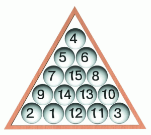 В начале игры все играемые шары следует установить в пирамиду в определенном порядке. В вершину пирамиды, на 3-ю точку игрового стола, устанавливают шар под номером «4». В углах, при основании пирамиды, размещают шары с номерами «2» и «3». Шары, дающие игрокам наибольшее количество сыгранных очков, – «13», «14» и «15» – ставят в середину.