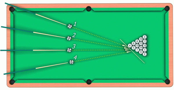 Для правильного проведения наката по боковым шарам необходимо вообразить линию, соединяющую серединную лузу с лежащей на противоположном борту стола угловой. При нанесении первого удара следует учитывать то обстоятельство, что результативность хода во многом зависит от того, насколько большим окажется путь «своего» шара до воображаемой линии. В том случае, если наносить удар, поставив биток в точки 1–4, пирамида окажется наименее разбитой. Однако поскольку «свой» шар рикошетом коснется «чужих», то, лишь слегка сдвинув их с места, он сам может упасть в лузу, за что игрок неизменно получит штрафные очки.