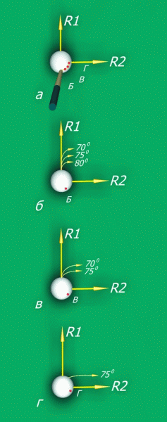 а) угол падения равен углу отражения. Это касается прямого удара, который наносится точно в центр играемого шара;