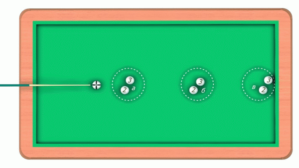 В середине стола на основании мысленно представляемого равнобедренного треугольника стоят шар «1» и шар «3», а на вершине – «2». Вокруг «тройки» игрок мелом чертит круг. В зоне этого круга должен оказаться шар «1» и два прочих после удара.